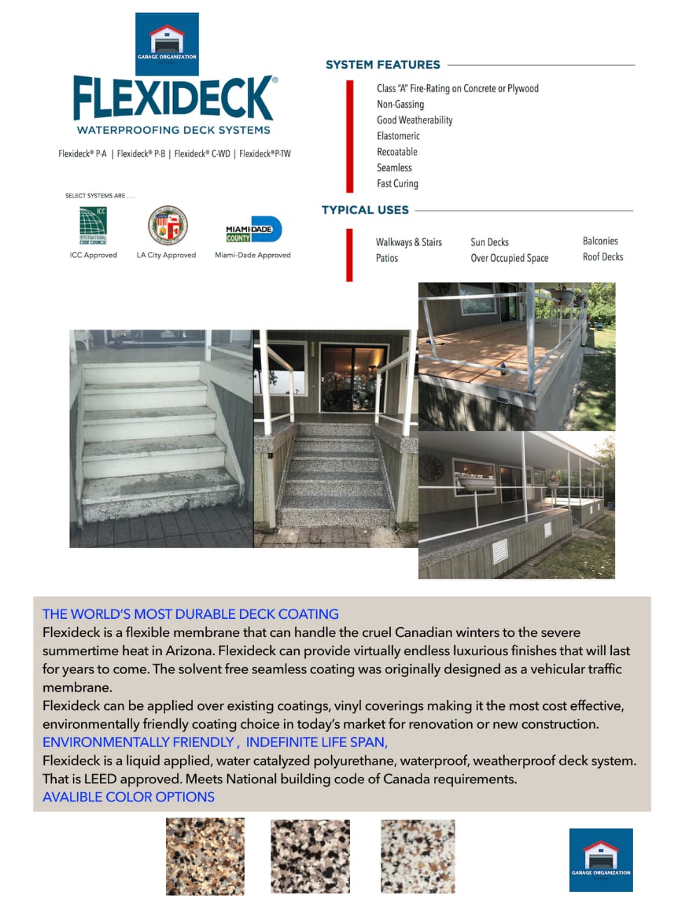 In as little as 2 days, your wood deck could be protected and beautified. Our multi-layer system is thick and provides lifetime waterproofing for sundecks, flat roof decks, and much more. Our leading edge waterproofing solution is not a paint on thin film, or roll-on coating. Our coatings last decades and were built to stand up to harsh Canadian climates. Our system is an ideal alternative to flame-applied membranes and other common waterproofing problems such as suspended slabs and roof decks. We are a reputable company with 10 years experience and we will be doing coatings for years and years to come.